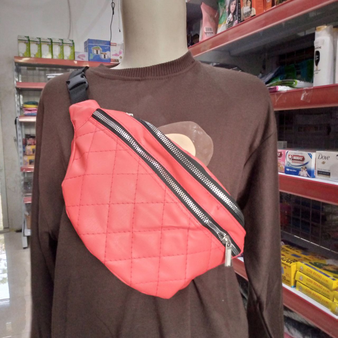 Waistbag wanita warna marun bahan julit sintetis, pas banget dikenakan saat event jogging pagi, atau santai bersama teman,